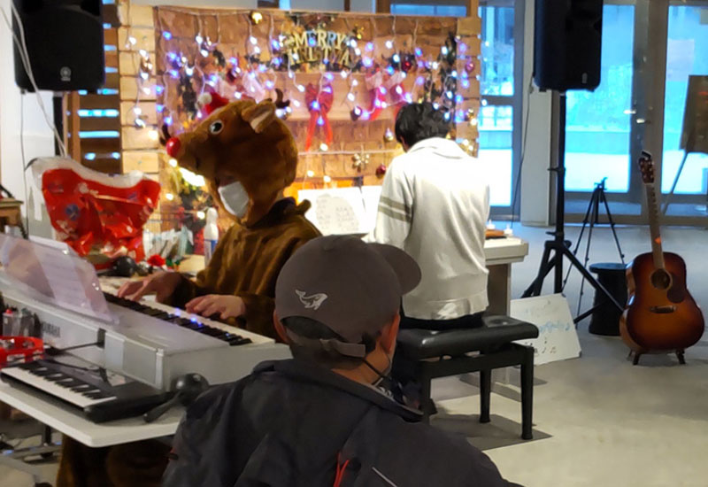 この日のイベントは、12店舗が出展した「としのせ★フリーマルシェ」と絵画展、クリスマスのオーナメントづくりと同じフロアで開かれ、来場者、関係者ともお互いに交流する場となった。会場にはストピリエゾンが持ち込んだ電子ピアノが置かれ、今井さんらはクリスマス前ということでサンタとトナカイの縫いぐるみ姿で登場。クリスマスの装飾を施したミニステージで演奏者を迎えた。