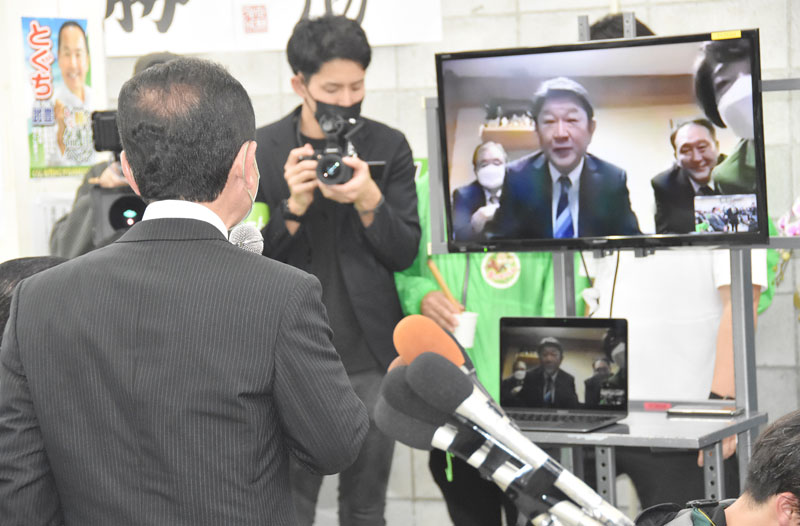 渡具知氏の選挙事務所には、開票を見守る茂木敏充自民党幹事長の姿がモニターで映し出されていた。夜10時すぎ、渡具知氏の当確が出て、万歳三唱をした後、茂木氏は「国の立場からも全力で(名護振興を)バックアップしたい」と力強く述べた。