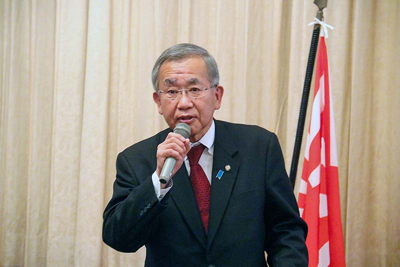 「パレンバンデー」であいさつする奥本康大会長=14日、東京・九段北