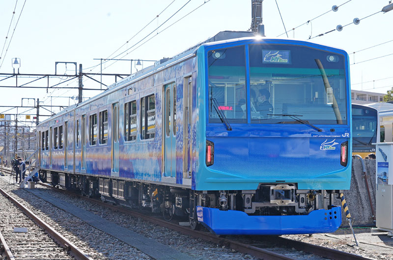 JR東日本は18日、水素を燃料とする電池と蓄電池のハイブリッド方式で走る国内初の試験車両「HYBARI(ひばり)」を報道陣に公開した。3月下旬から南武線(川崎-登戸)などで走行試験を始め、2030年の実用化を目指す。開発費は約40億円。