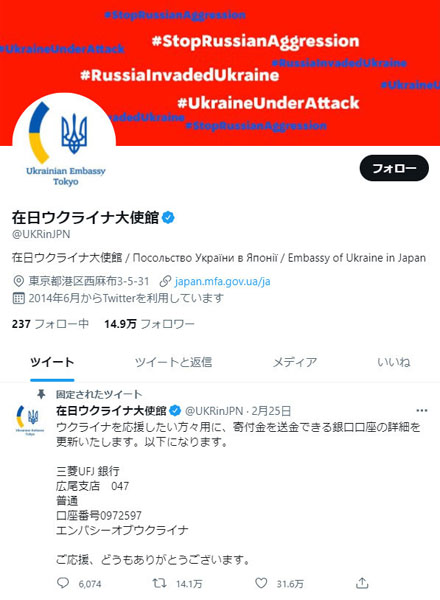 在日ウクライナ大使館(東京都港区)は侵攻直後の2月25日、寄付を受け付けるための専用口座を開設した。同大使館によると、3月1日までに6万人以上から20億円近くが集まったという。ツイッターやフェイスブックを通じ「少しでも力になれれば」などのメッセージが寄せられ、大使館は「ウクライナ国民にとって困難な今の時期にご支援くださいました日本の友人の方々に、心から感謝しています」と謝意を記した。