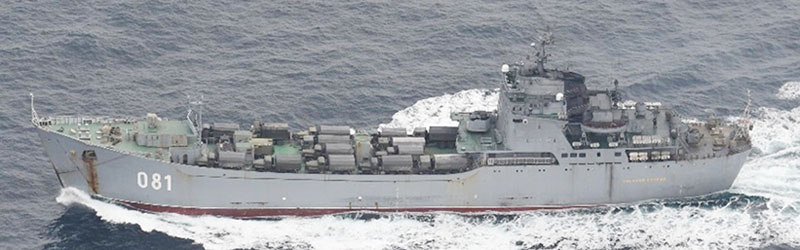 津軽海峡を通過したロシア海軍のアリゲーターⅣ級戦車揚陸艦。甲板にウクライナへの増援とみられる軍用車両を載せている(防衛省統合幕僚監部提供)
