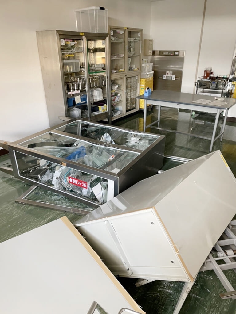 3月16日夜、震度6弱の揺れに襲われた病院では、当直や駆け付けた職員らが協力して対応に当たった。幸い人的被害はなかったが、配水管の漏水や壁面のひびなどが新たに見つかった。