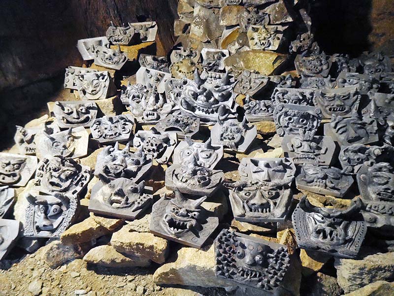 洞窟が掘られたのは出土物から紀元前100年頃とされ、近世では大坂城の石垣の石も切り出されている。内部には鬼の大広間や居間、鬼番人の控え室などが再現され、赤鬼や青鬼に桃太郎らの人形が配置されている。無数の鬼瓦が敷き詰められているのは「オニノコ瓦プロジェクト2」(オニノコプロダクション)という瀬戸芸の作品。