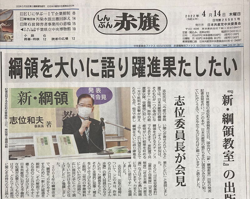 志位委員長は4月13日、国会内で『新・綱領教室』(上、下)出版の発表記者会見を行った。2004年に大幅に改定した綱領と、2020年に開催した28回党大会で一部改定した綱領や、ロシアのウクライナ侵攻などの最新情勢をまとめて解説したもの。7月投開票の参院選で国民への理解を広げ「躍進」を果たすことを期すとともに、野党共闘への吸引力を強めるのが狙いだ。