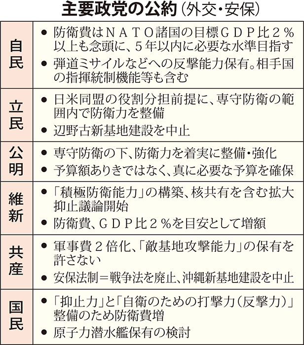 防衛費について野党は割れている。「積極防衛能力」の整備を掲げる日本維新の会と、「自分の国は自分で守る」と唱える国民民主党は増額を掲げる一方で、立憲民主党は専守防衛の範囲内で防衛体制の強化を図るとし、「総額ありきではなく、メリハリのある予算で」と増額論に与(くみ)しない。かつて党幹部が防衛費を「人を殺すための予算」と呼んだ日本共産党は「軍事費2倍化は許さない」と叫んでいる。