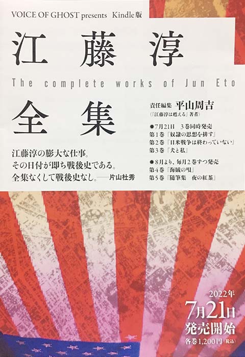 7月21日に第1巻「奴隷の思想を排す」、第2巻「新版 日米戦争は終わっていない」、第3巻「犬と私」の3巻が同時発売された。8月は第4巻「海賊の唄」、第5巻「随筆集 夜の紅茶」と以後毎月2巻ずつの発売となる。『江藤淳は甦える』(第18回小林秀雄賞受賞)の著者、平山周吉氏の責任編集になる。