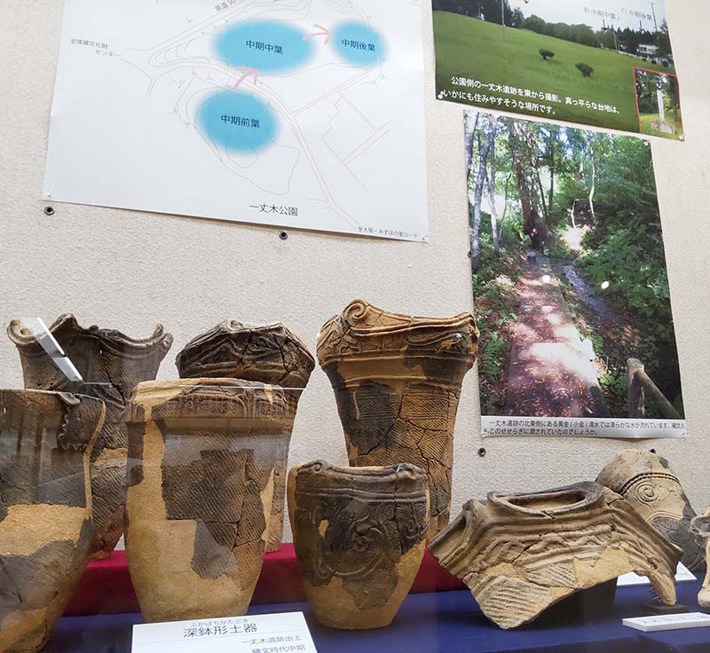 一丈木遺跡の特徴は、二つの土器の型式が混ざりあっていること。大きいものでは直径約30センチ、高さ約50センチもある深鉢で、煮炊き用。当時、県南部は「大木(だいぎ)式」が主流だが、県北の「円筒式」と混合した土器もあり興味深い。大木式はギザギザや渦、楕円(だえん)が描かれ、デザインがおしゃれ。