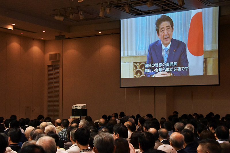 改憲派の集会にビデオメッセージを寄せた安倍晋三・自民党総裁 =2018年5月3日、東京千代田区の砂防会館別館(森啓造撮影)