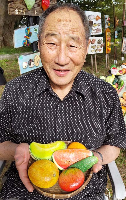 拾ってきた石に絵を描く「石ころアート」を10年以上続けているのが、秋田県北部の三種町(みたねちょう)に住む宮田紘孝さん(82)。自身を「路傍の石愛好者」と呼ぶ。果物、魚、アニメのキャラクター、そして風景と絵柄は多種多様。ワークショップも開き、愛好者が増えている。