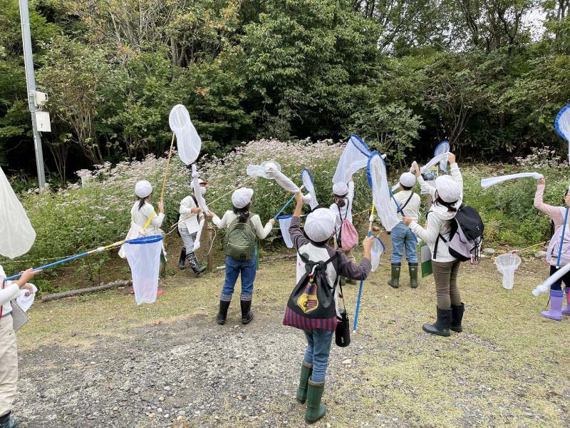 当日は6、7人ずつ混合でグループを編成し、教わった通り、タオルを回してアサギマダラをおびきよせ,近づいたところを網で捕獲していた(写真=宝達小学校HPより)。