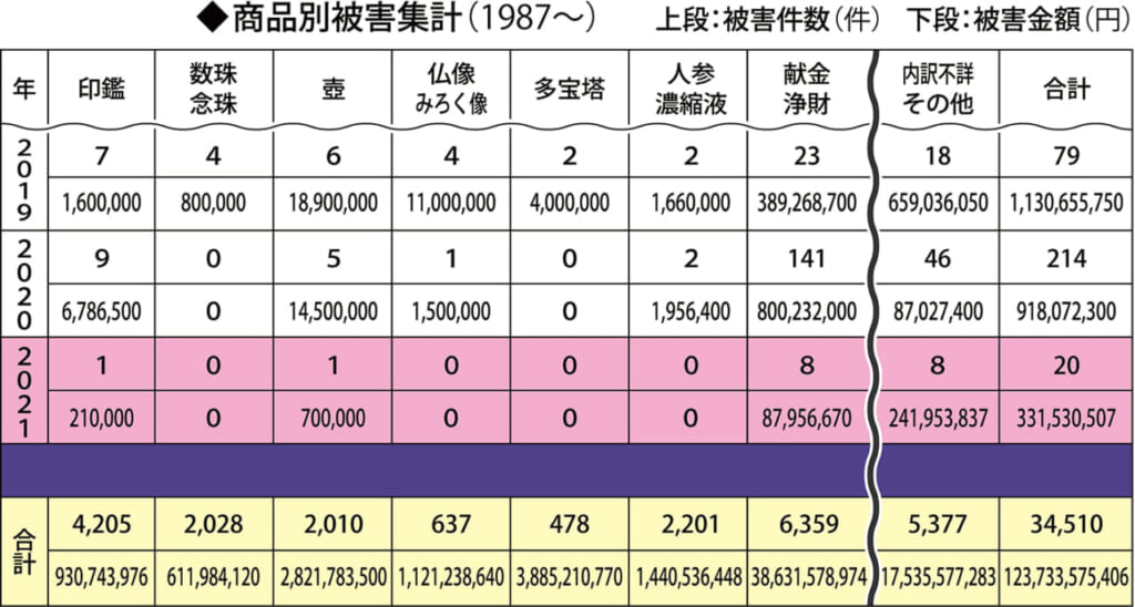 「霊感商法は摘発と法改正でやりにくくなったため、既存信者からの献金への比重を大きくしたと思われます。それでも全国弁連には昨年、印鑑が九件、壺で五件の相談がありました。〇九年以降の被害も含まれています」