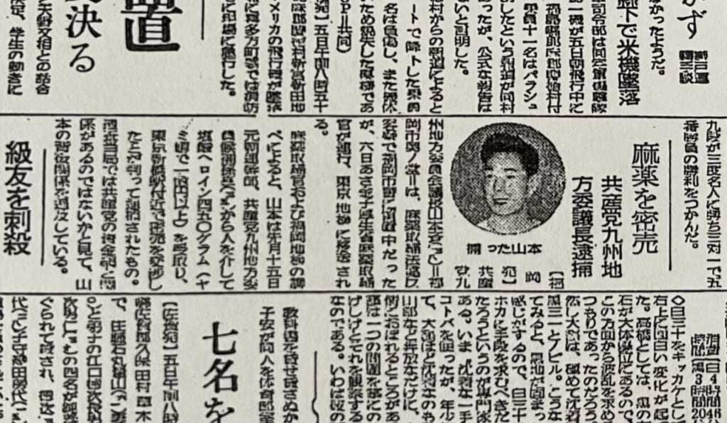 その結果、朝鮮人孫享の依頼によりヘロイン約450㌘を受け取り密売しようとした山本斉らを逮捕した。「朝日新聞」50年10月6日付は「麻薬を密売 共産党九州地方委議長逮捕」の見出しで党の地方幹部だった山本を顔写真入りで報道。捜査当局が「共産党の資金網と関係があるのではないか」と見て、山本の背後関係を追及していると伝えている。
