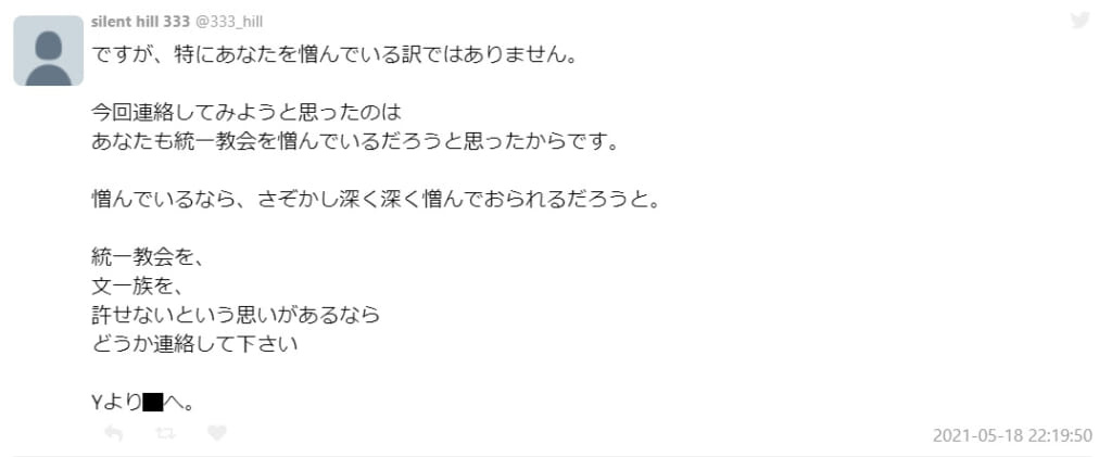 山上容疑者は、事件の数年前にかつて面識のあった教団の元幹部に宛て、「今も統一教会を憎んでいますか」とのメールを送っている。さらにツイッター上にも21年5月、「統一教会を、文一族を、許せないという思いがあるならどうか連絡して下さい」と同幹部に向けたと思われる投稿をしている。わざわざ他の利用者が閲覧できる場所にこのような文章を残したのも、暗に協力者を探すためとみられる。