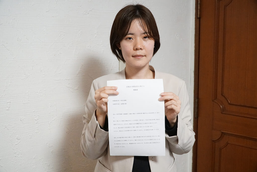 世界平和統一家庭連合(旧統一教会)は21日   政府が検討する同宗教法人の解散命令請求2万3486通の「嘆願書」を文化庁に郵送した。「嘆願書」は全国の信者から郵送やFAXなどで教団本部に届けられたもの。嘆願書を書いた一人で、教団の二世信者の小嶌希晶さん(27)が23日、取材に応じ、「私の両親は国際結婚で、教会がなければ私は生まれていなかった。だから『教会がなくなったらいい』と言われるのは、自分自身の存在価値を否定されている気がする」と訴えた。