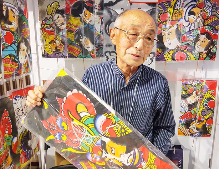 小野さんのもとには画帳が70種類ほどある。中でも源平合戦の平敦盛(あつもり)と熊谷次郎直実(なおざね)、五条大橋の牛若丸と弁慶の絵が好評だ。赤、緑、黄、紫など極彩色を使い、槍(やり)や巻物などを持った手を画面に入れるのも湯沢凧の特徴。