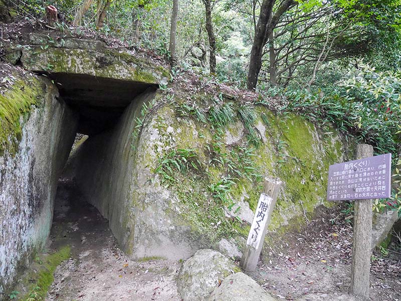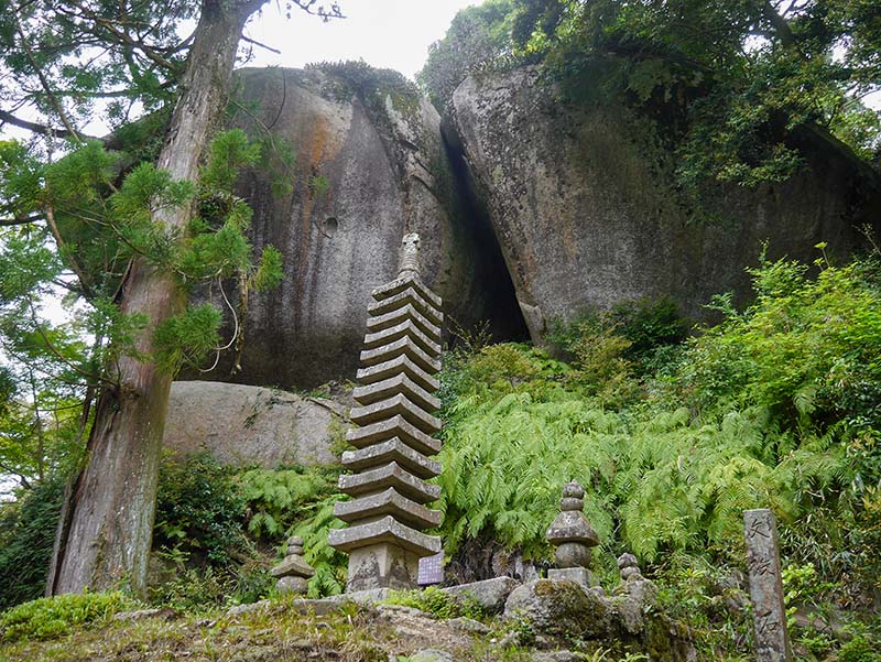 山門をくぐると本坊、毘沙(びしゃ)門堂(もんどう)、鐘楼(しょうろう)などの奥に一周約800㍍の山道に沿って修行場がある。修行場には「胎内くぐり」「蟻の戸渡り」「ゆるぎ石」などと名付けられた岩が点在し、途中に本尊の弥勒磨崖仏や正月堂(弥勒磨崖仏の礼堂)、石造十三重塔、虚空蔵菩薩磨崖仏、後醍醐(ごだいご)天皇行在所(あんざいしょ)跡などがある。山頂にも巨岩があり、そこから木津川を見下ろす風景は絶景。険しい岩場には足を掛けるために石を穿(うが)った跡もあり、山岳修行の歴史が刻まれている。