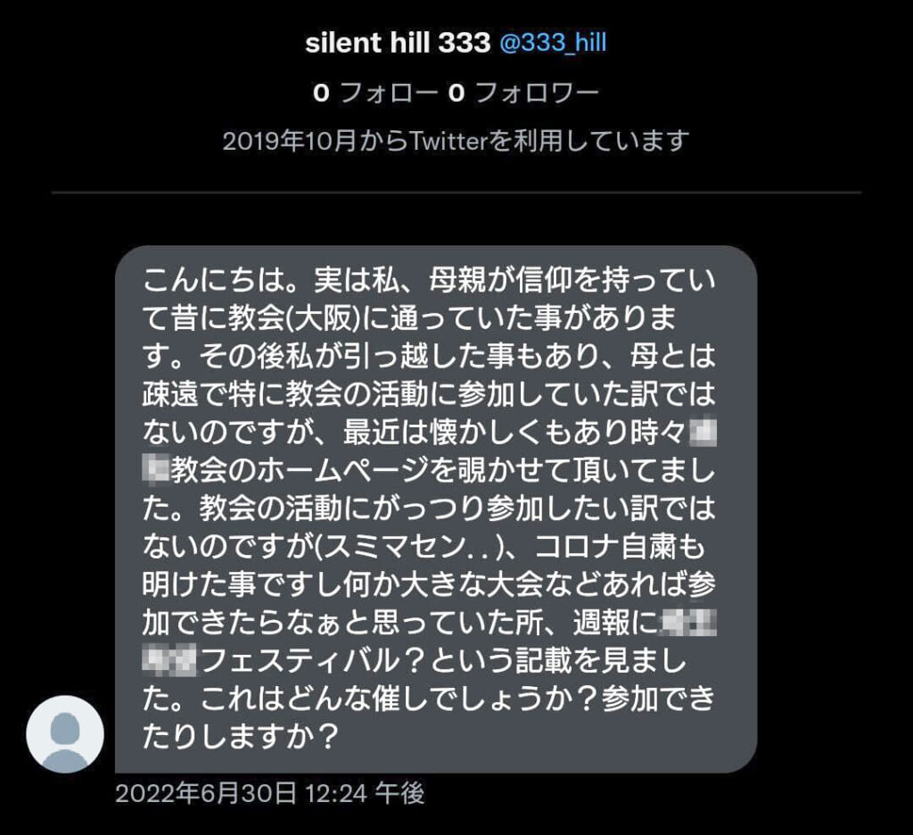 その上で「教会の活動にがっつり参加したい訳ではないのですが」と控えめな態度を示しつつも、さも教会を懐かしみ戻りたがっている元信者を装う形で、「コロナ自粛も明けた事ですし何か大きな大会などあれば参加できたらなぁと思っていた所、週報に〇〇フェスティバル?という記載を見ました。これはどんな催しでしょうか?参加できたりしますか?」と質問している。