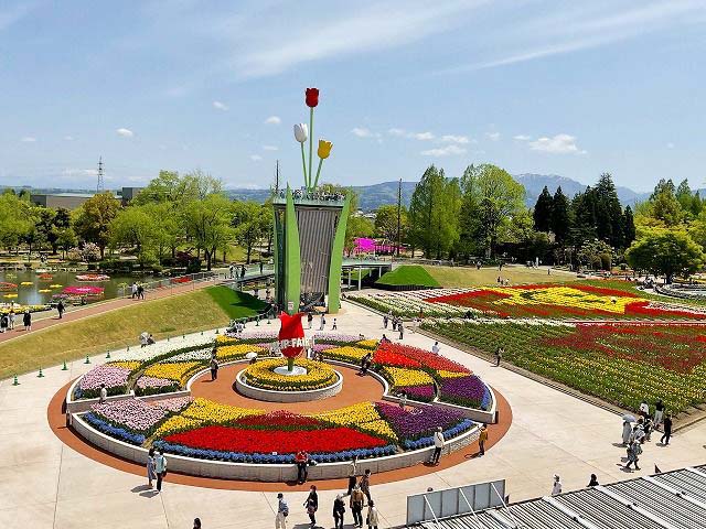 好評の円形花壇は、中央の大きなチューリップモニュメントが特徴的で、12品種3万7000本の色とりどりの花が咲き誇り、人気のフォトスポットとなっている。今年の3月、4月は予想以上に気温が高く開花状況が例年より早まっているので、事務局では4月中の来場を勧めている。