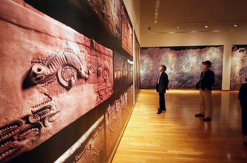 中でも、土器の周り360度の文様を一画面に収めた「展開写真」の数々は小川氏の代表作。氏はカメラマンとして活動する中で土偶や火焔(かえん)型土器などに出合い、日本各地のべ2000カ所以上で3万枚を撮った。同様の写真展を2回開催したが、今回はそれらを上回るスケール。