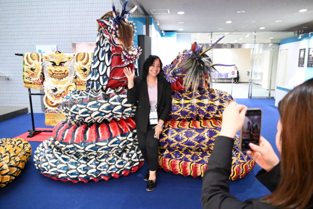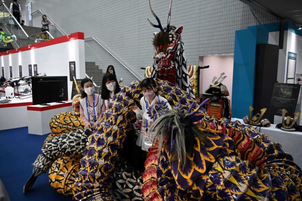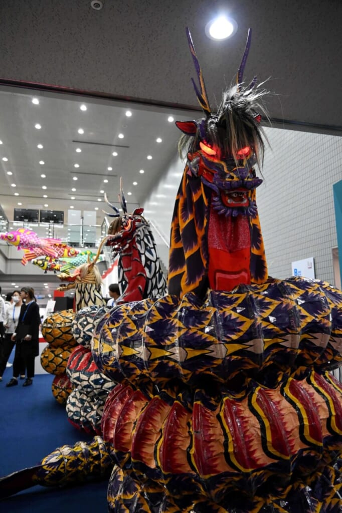広島県内5市町の神楽団体で構成される広島神楽団が21日、G7サミットの国際メディアセンターで大蛇の衣装を披露した。広島の伝統芸能「広島神楽」の演目「八岐大蛇」に登場する大蛇で、そのダイナミックな動きを見た人たちからは「すごい」「びっくりした」と驚きの声が上がった。