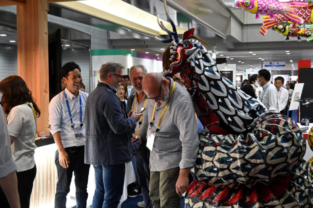 演目「八岐大蛇」は、スサノオノミコトが巨大な人食い大蛇に毒酒を飲ませて成敗する物語。大蛇の衣装は和紙製で軽く、演者はとぐろを巻いたり尾を持ち上げたりとさまざまな「技」を持つ。目を光らせたり、演目中には口からは花火を発射することもできるという。初めて神楽の大蛇を見たという海外の女性は「怖かったけど、意外にかわいい」と笑顔を浮かべた。