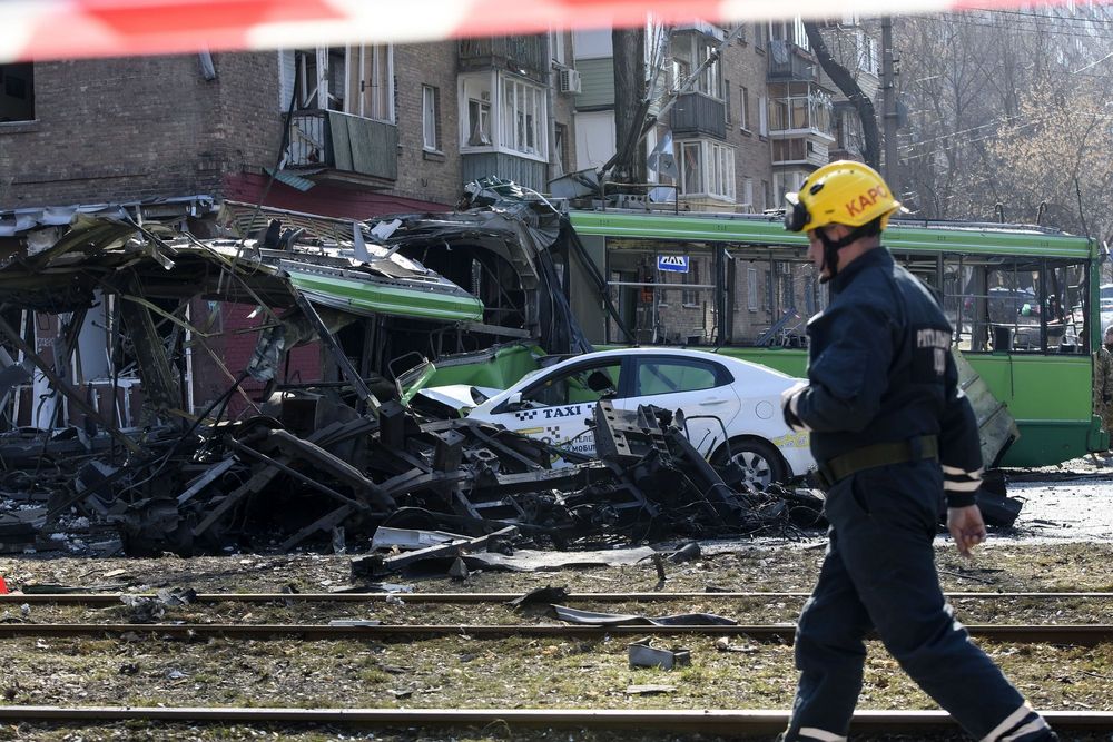 ロシアの爆撃で破壊された建物や車両=キエフ市内、2022年3月14日(UPI)
