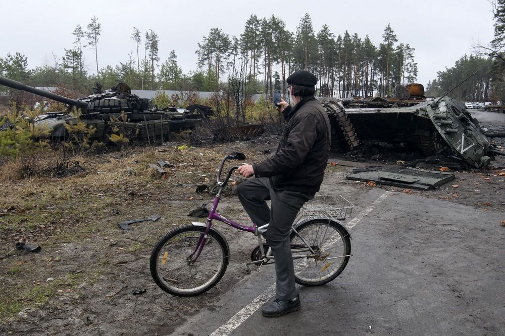自転車に乗る地元住民の前に横たわる破壊されたロシア軍の戦車=キーウ近郊ブチャ、2022年4月3日(UPI)