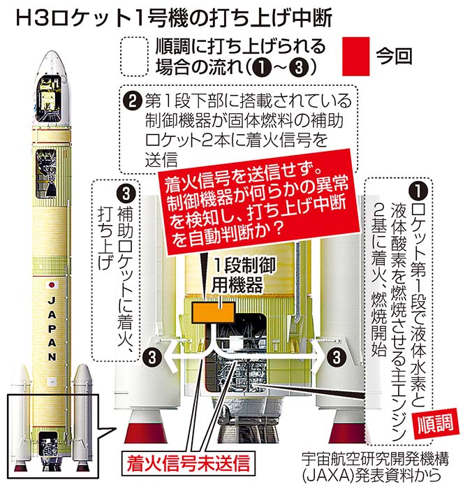 宇宙航空研究開発機構(JAXA)によると、主エンジンが燃焼を開始した後、1段目機体の制御機器がエンジンへの電源供給系統で異常を検知。補助ロケットへの着火信号を送らず、主エンジンも停止させた。制御機器内には、電池からエンジンに電源を供給するスイッチがあるが、何らかの異常によりスイッチが一時的に切れ、電源が供給されなくなったという。
