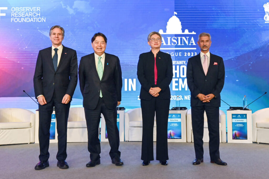 会合には林芳正外相、ブリンケン米国務長官、ジャイシャンカル印外相、ウォン豪外相が参加した。共同声明では、ウクライナ侵略を続けるロシアを名指しした非難は避けつつ「核兵器の使用または威嚇は許されない」と強調。侵略に反対する姿勢を改めて確認した。