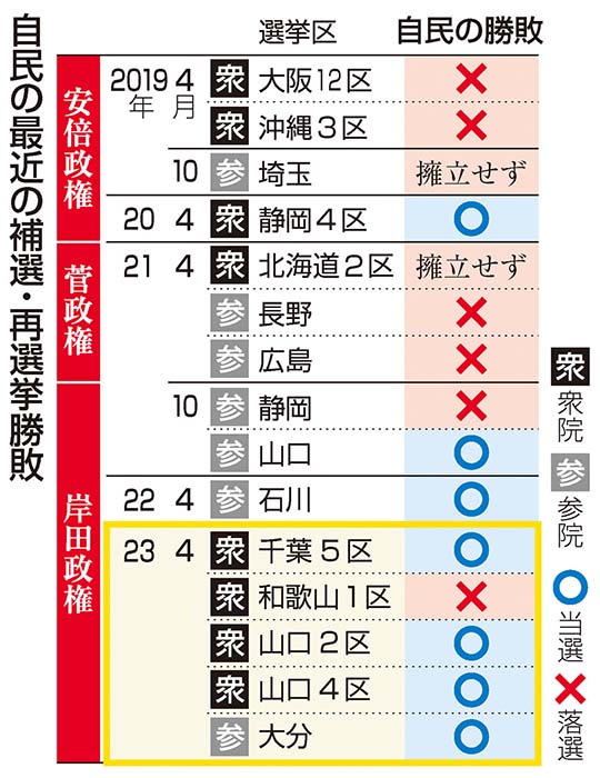 接戦となったのは衆院の山口2区、千葉5区、参院の大分選挙区だった。山口県は安倍晋三元首相の死去に伴う4区と岸信夫前防衛相が病気により引退した2区で行われたが、両区とも自民の“必勝区”だった。