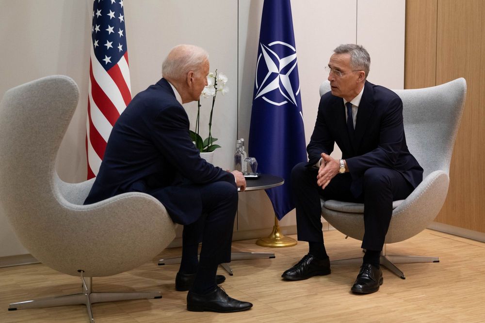 バイデン米大統領と会談する北大西洋条約機構(NATO)のストルテンベルグ事務総長=2022年3月24日(UPI)