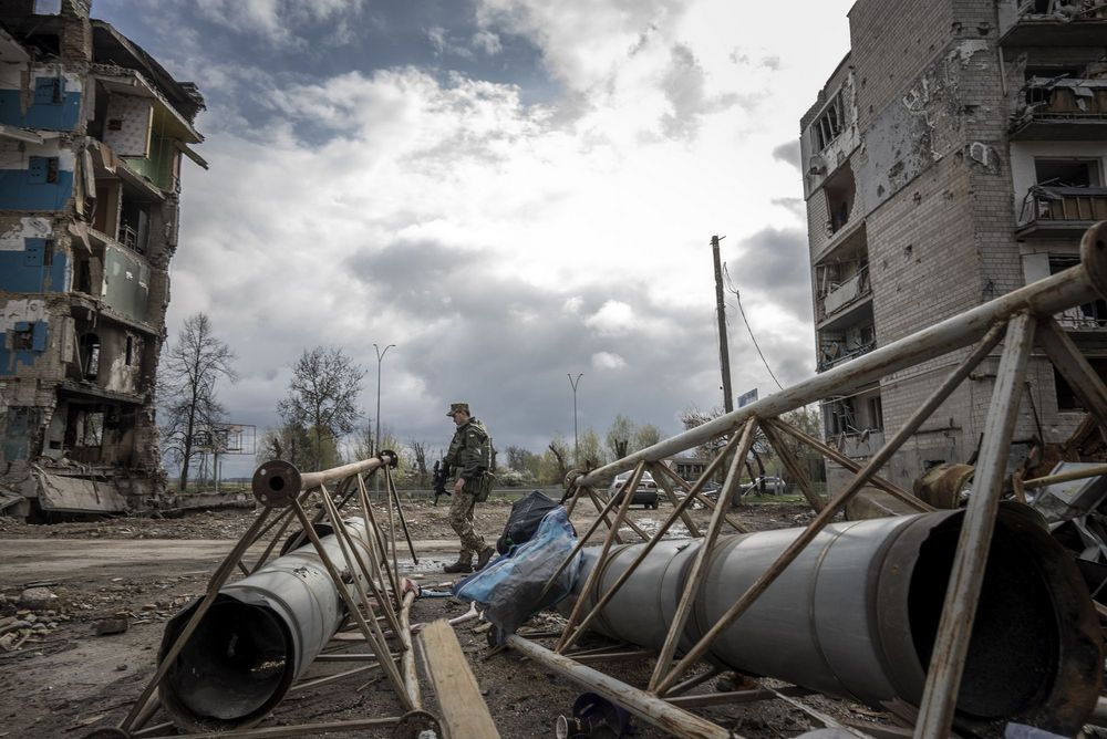 ロシアのミサイル攻撃で破壊されたキーウ近郊の町ボロディアンカ=4月26日(UPI)
