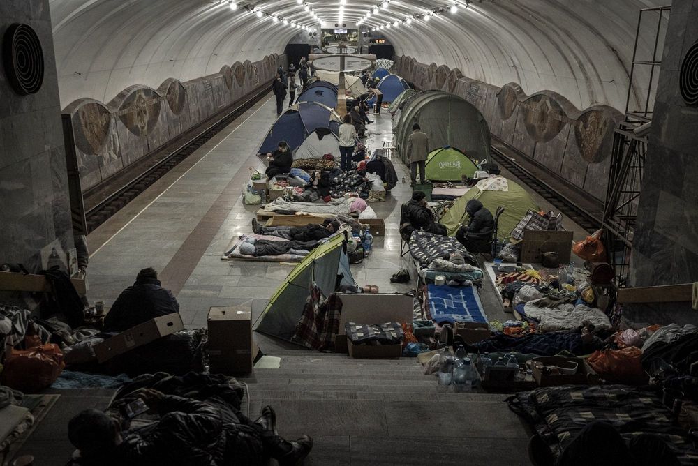 ウクライナ北東部の都市ハルキウでロシアの空爆を避けるため地下鉄の駅で避難生活を強いられるウクライナの市民ら=ウクライナ北東部ハルキウ、4月28日(UPI)