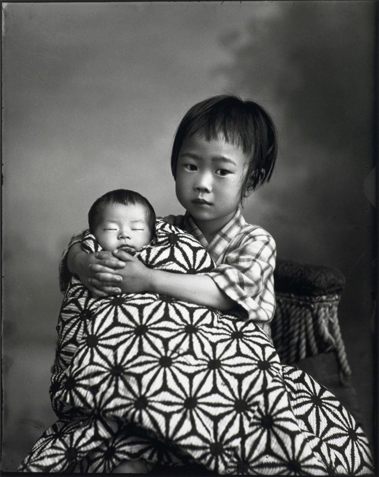 大きく見開いたつぶらな瞳に、緊張感が漂う。父が、「しっかりとこちらを見て」と声を掛けたからか、母が「赤ん坊をしっかりと抱いて」と言葉を掛けたせいだろうか。両手で強く抱かれた赤ん坊は美しい寝間着に包まれている。赤ちゃんの安らかな寝顔と、ナルミの緊張感に満ちた表情のコントラスト。