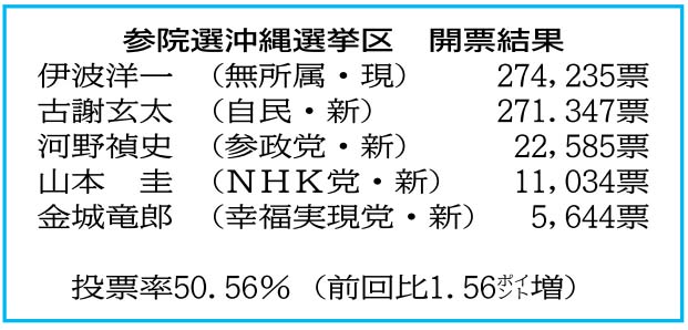 参院選が10日、投開票され、沖縄選挙区では革新系の無所属現職の伊波洋一氏(70)が自民公認で公明が推薦する新人の古謝玄太氏(38)を僅差で破って再選を果たした。保革の激しい一騎打ちとなったが、2カ月後に迫る知事選(9月11日投開票)に影響を及ぼすとみられる。(沖縄支局・豊田 剛)