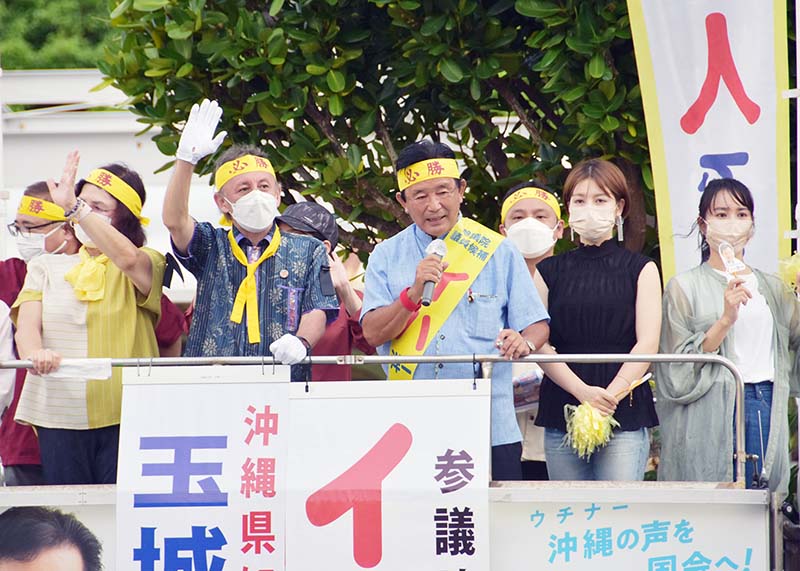 9日夕方、那覇市で行われた打ち上げ演説で、伊波氏は「基地のない平和な沖縄をつくり、この島を2度と戦場にしないことを約束する。憲法9条の改悪を許さず、沖縄を軍事化させないようにしっかり取り組む」と訴えた。選挙戦では「基地のない平和な島」をスローガンに、米軍普天間飛行場(宜野湾市)の名護市辺野古移設や南西諸島の自衛隊強化に反対を一貫して訴えた。