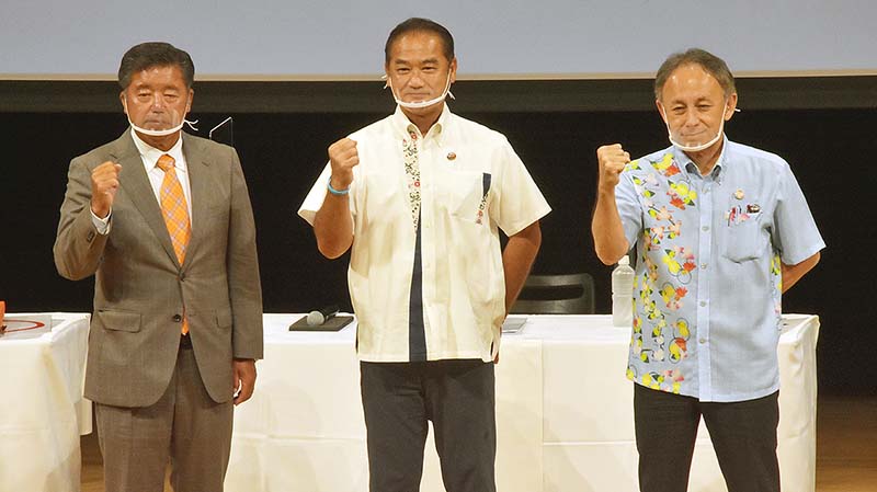 玉城氏は20日、名護市で行われた決起大会では「辺野古に新基地はいらない。50年、100年先の子供たちに基地負担を押し付けることはやめさせよう」と訴えた。