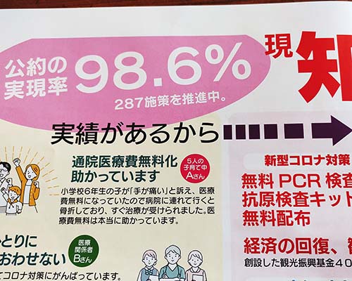 ところが、291項目のうち実際に達成できたのはわずか8項目だけだ。内訳は、8が完了、279が着手済み、調整中は4項目。これを玉城氏は着手し、予算化しているものを含め、287項目を実現したと独自の認識を示している。候補者討論会や街頭演説で98・6%という実現率を訴え、法定ビラでもこの数字を強調している。