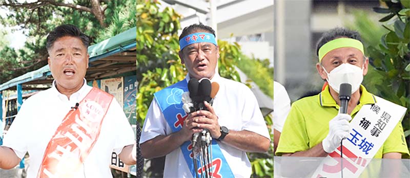 出馬しているのは届け出順に、元郵政民営化担当相で無所属新人の下地幹郎氏(61)、前宜野湾市長で無所属新人の佐喜眞淳氏(58)=自民、公明推薦=、2期目を目指す無所属現職の玉城デニー氏(62)=立民、共産、社民、社大、にぬふぁぶし、れいわ推薦=。実質的に玉城氏と佐喜真氏による一騎打ちの情勢だ。