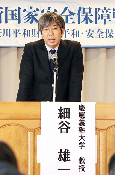 シンポジウムでは慶応義塾大学教授の細谷雄一氏が「歴史的転換のなかの日本の針路―新しい国家安全保障戦略を考える―」と題して基調講演を行った。細谷氏は現在の安全保障環境について「冷戦後、米国は楽観的に、中国やロシアと経済協力を深めて協力する融和政策と協調政策の中間のような方針を取ったが、これが裏切られた現状が今の世界だ」と分析。